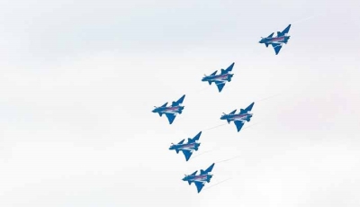1月30日上午,中国空军八一飞行表演队在新加坡樟宜机场海面上空展开空中特技动作飞行。