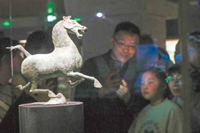 每当晨曦初露,甘肃省博物馆开馆,奔涌的人流慕名而来,涌向神秘的铜奔马。夜晚的博物馆却更显热闹,延长的开放时间增加了观众与文物见面的机会,观众更能在别样的灯光与活动中感受夜探铜奔马的魅力。