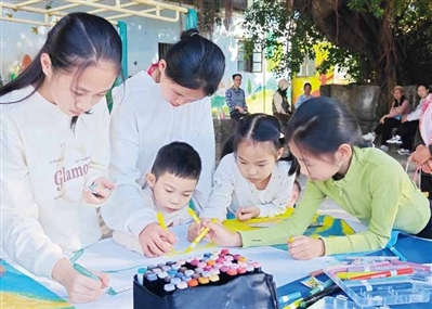 孩子们在龙湾村文化广场的树荫下专注绘画。刘昭融 摄