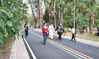 4日,记者在施工现场看到,崭新的沥青步道平整铺开,工人们正进行最后的彩虹划线收尾工作。随着划线机的匀速推进,三色漆带在路面渐次呈现,与周边错落有致的花草树木相映成趣。不少市民已迫不及待地踏上这条“新鲜出炉”的彩虹路,或慢跑,或快走,或驻足拍照,欢声笑语在园内回荡。