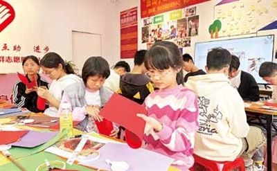 科普环节结束后,青少年们在志愿者的引导下走进生活垃圾分类宣教馆。馆内丰富的图文展板、生动的多媒体演示、有趣的游戏互动迅速吸引了大家的目光。青少年们纷纷驻足观看、动手体验,在沉浸式参与中进一步加深了对垃圾分类的认识。在手工实践环节,青少年们充分发挥创意,利用废旧纸巾筒动手制作“纸筒烟花”,在剪、折、粘、贴的动手创作过程中,切身感受“变废为宝”的环保意义。