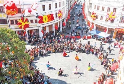 阳江春节民俗巡游队伍来到十字街,受到市民游客热捧围观。梁文栋摄
