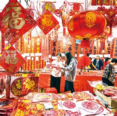 年货摊上,春联的摊位前挤满人。红底黑字的对联配上金色流苏,喜庆又不失文雅。不少市民在选购手写春联。一名市民说,贴春联是阳江人过年的传统,手写的比印刷的更有温度。