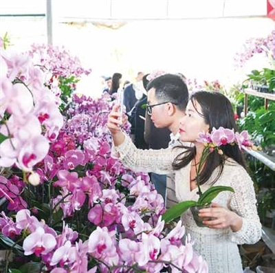 市民在花市挑选蝴蝶兰。梁文栋 摄