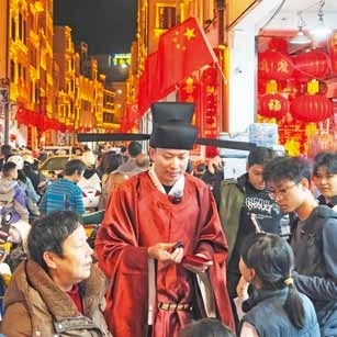 身穿古装的“财神”用现代科技送福。马实飞 摄