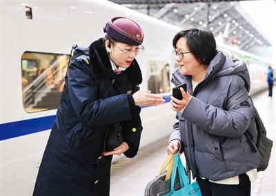 图②在南京火车站,乘务人员在站台上解答旅客问询。