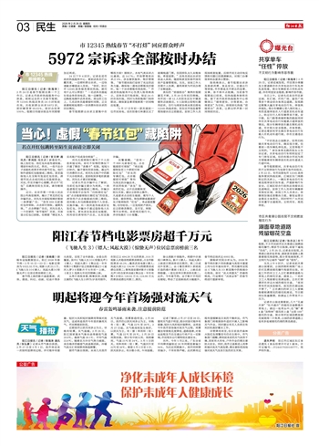 阳江日报讯(记者/吴晓霞)猫眼专业版数据显示,阳江2026年春节档(2月15日—23日)电影总票房为1022.32万元,观影人次22.1万。《飞驰人生3》《镖人:风起大漠》《惊蛰无声》位居总票房榜前三名。