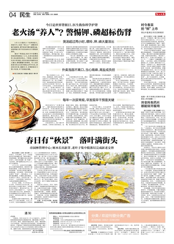该技术人员表示,市区“春风扫落叶”现象最明显的树种是桃花心木,主要分布在新江北路、石湾路、西平路、创业北路等路段。其他路段栽种的细叶榄仁、木棉树、紫荆树、凤凰木、风铃树等树种也会在春天换叶,而细叶榕、大叶榕、黄葛榕等虽是常绿树种,但到季节交换时节也会落掉大部分枯叶或老叶。