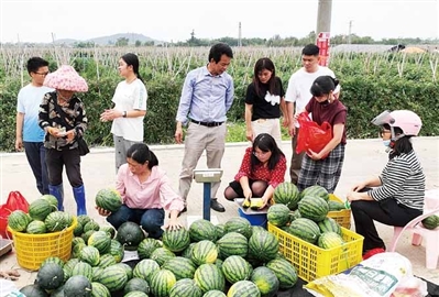 品种改良带来的不仅是品质提升,更是实实在在的市场认可和瓜农增收。种植户张伙生今年种了10亩“锦霞”西瓜。在田地里,他摘下一个西瓜,用大拇指在西瓜顶部用力一敲、一掰,金黄细腻的瓜瓤便露了出来。“不用刀切,吃瓜很方便!”张伙生打趣道,“现在瓜小了,更甜了,卖得更好了。”如今,通过社群销售,他一天能卖出五六百斤西瓜,还有不少游客来瓜田体验摘瓜乐趣。