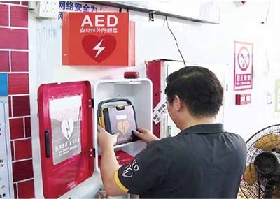 右图:工作人员正在农贸市场安装AED。王麟惠 摄