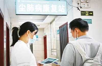 在中医科室做完针灸理疗,他们开始做踩单车、拉滑轮等有氧运动。“患者每次过来,医生都要测量他的心率、血压、血氧等基本身体数据,并定期测试肺功能,指导其进行后续的康复。”该站护士刘琼介绍,由于肺部纤维化不可逆转,尘肺病是无法治愈的。但尘肺病患者不能不运动,他们需要呼吸和运动训练,减缓肺功能的退化。