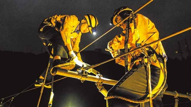 右图:1月29日,中国铁路南宁局集团有限公司接触网工在支柱顶部测量锚段关节的数据参数。新华社发