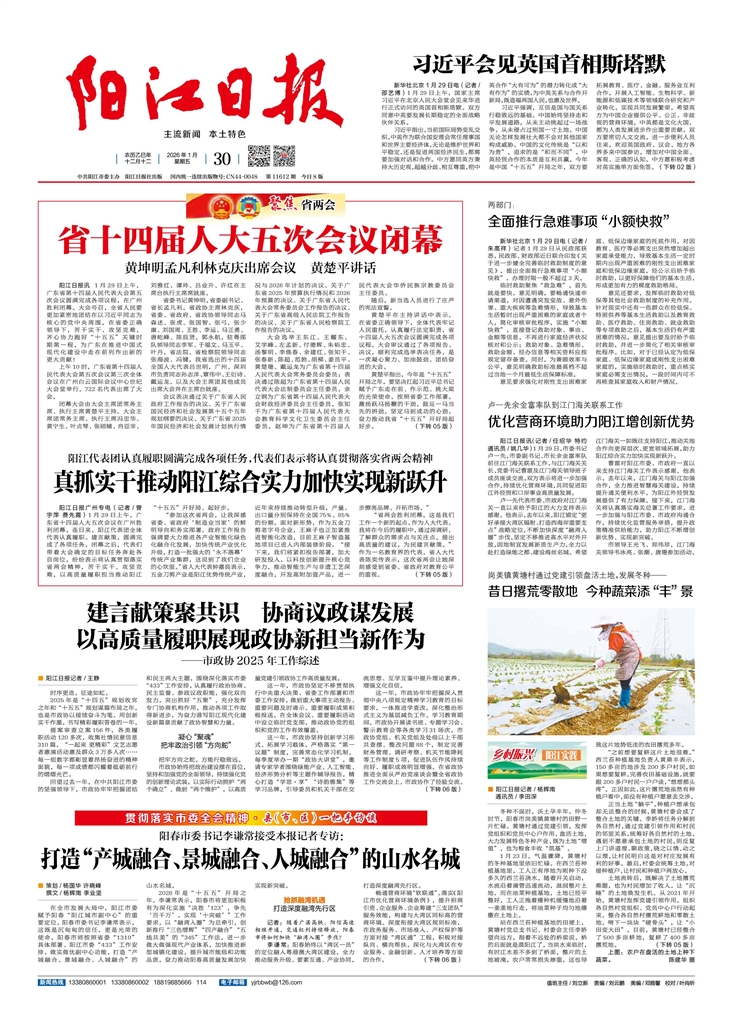 - 建言献策聚共识 协商议政谋发展 以高质量履职展现政协新担当新作为 阳江日报广州专电(记者/曾宇萍 费先霞)1月29日上午,广东省十四届人大五次会议在广州胜利闭幕。连日来,阳江代表团全体代表认真履职、建言献策,圆满完成了各项任务。闭幕之后,代表们带着大会确定的目