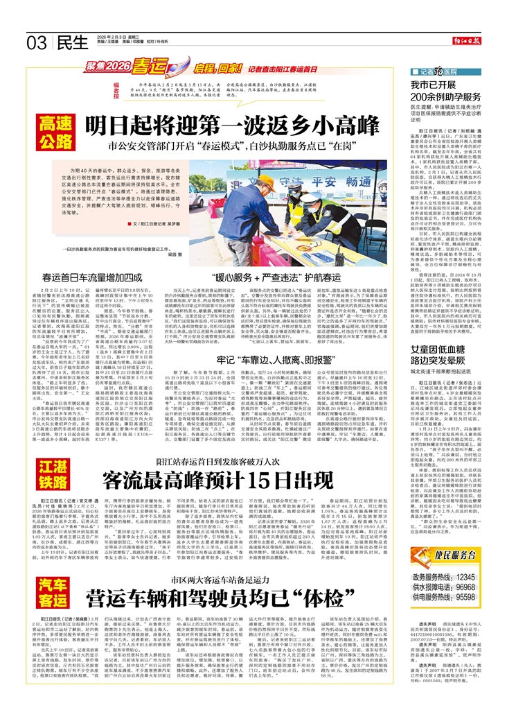 - 高速公路 明日起将迎第一波返乡小高峰 聚焦2026春运启程,回家!记者直击阳江春运首日 编者按 今年春运从2月2日起至3月13日止,共计40天。9天“超长”春节假期,阳江各交通枢纽或将迎来创历史新高的返乡人潮。本报记者分赴高速