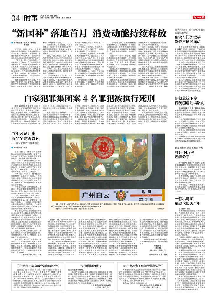 - 白家犯罪集团案4名罪犯被执行死刑 新华社深圳2月2日电 2025年11月3日,广东省深圳市中级人民法院以故意杀人、故意伤害、诈骗、贩卖、制造毒品、绑架、开设赌场等罪,判处白家犯罪集团案白所成、白应苍、杨立强、胡小姜、陈广益等5人死