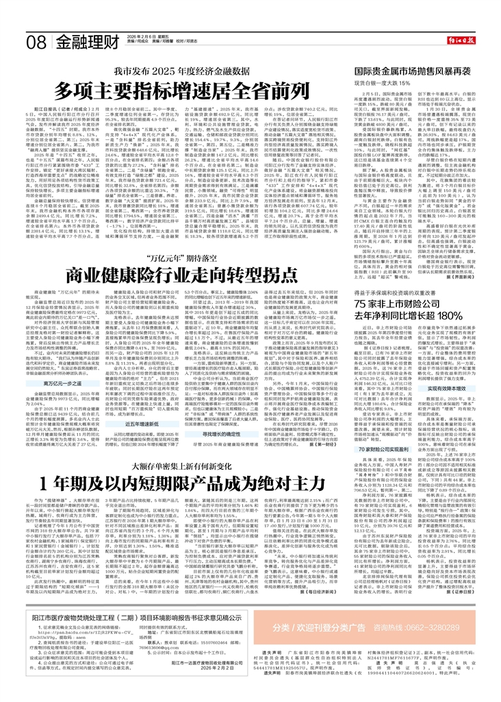 - 商业健康险行业走向转型拐点 商业健康险“万亿元年”的期待未能实现。 金融监管总局近日发布的2025年12月保险业经营情况表显示,2025年商业健康险保费最终定格在9973亿元,离此前业内期待的万亿关口“差一口气”。
