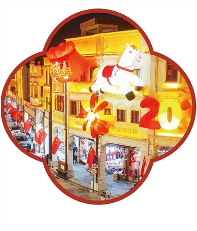 傍晚时分,华灯初上,人群熙攘。河堤路两岸,串串灯饰倒映江面,水光流转,甚是好看。年轻男女为夜景逗留,纷纷拿出手机拍照留影。孩童骑在大人的脖子上,享受着“最高”待遇游逛老街,感受着过年气氛。除了好看的风景,这里还有美食。河堤路的白切鸡、西濑风情街的杏仁茶……不少提前返乡的游子寻着味前来觅食。这一片区还是市民年货采办集中地。果脯瓜子零食铺、油炸酥角作坊、春联卖场……沿街商铺迎来节前客流高峰,购销两旺。
