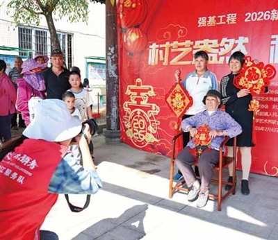 在一旁的拍照打卡区,不少村民们纷纷摆好造型,在镜头前留下温馨瞬间。村民吴阿姨手捧一个红色的“福”字,笑容满面地对着镜头。“现在村里每年都办村晚、送春联,今年还多了拍照打卡和农产品市集,活动更丰富了。”吴阿姨说道。