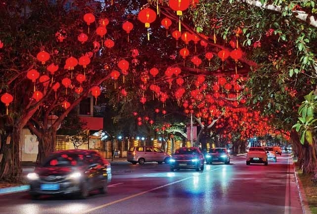 夜幕降临,阳东城区笼罩在温暖的光晕之中。2月8日晚,记者在阳东区湖滨路看到,道路两旁的树木及中央绿化带上均已装饰上缤纷的彩灯。鲜红的绸布灯笼与造型新颖的各类年灯相映成趣,在夜色中静静闪烁,将街道点缀得暖意融融。转入德政路,年味更显浓厚——道路两侧绿化树枝头挂满红灯笼,在半空中交织成一道绚丽的“红色穹顶”,吸引不少路人驻足拍照。