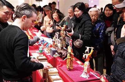 2月8日,在美国纽约举行的“中国味道”春节文化活动上,人们观赏面塑作品。