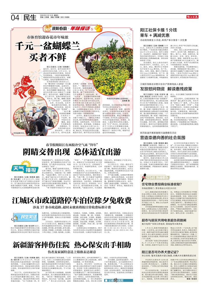 - 千元一盆蝴蝶兰买者不鲜 漠阳春韵·年味探访⑤ 阳江日报讯(记者/吴晓霞)逛花市、选年花,是市民刻在骨子里的年俗仪式感。2月12日,记者走进市体育馆花市看到,各色年花竞相绽放,一盆盆年桔硕果累累,穿梭其间的市民或驻足赏