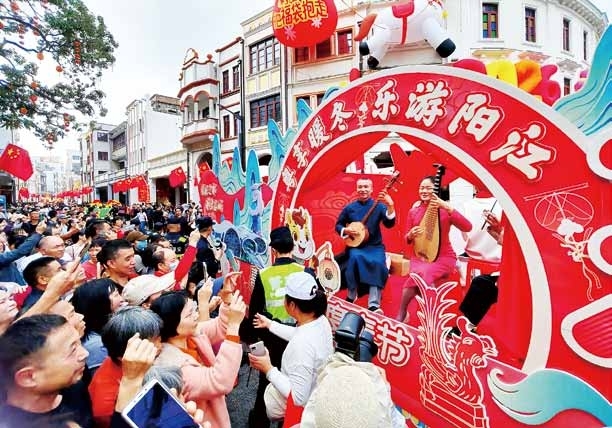2月21日,一场让阳江人乐开怀、追一路的新年“非遗大秀”,在市区南恩路、太傅路、河堤路等老街区绚丽铺展、热情演绎。