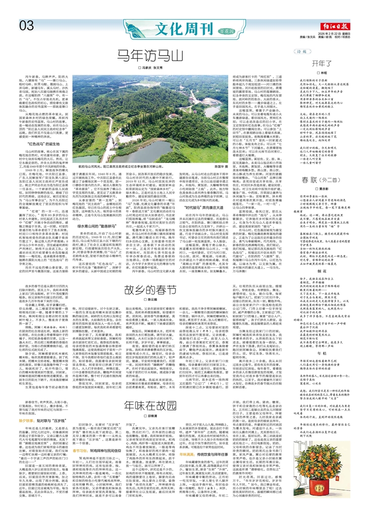- 马年访马山 □ 冯家庆 张文秀 丙午新春,马蹄声声。阳西大地,八镇皆有“马”——塘口马山、程村马岭、织乑马鞍、儒洞马山、上洋马岭、新墟马车、溪头马村、沙扒老马园,宛如八匹骏马驰骋在南海之滨。在这幅阳西“八