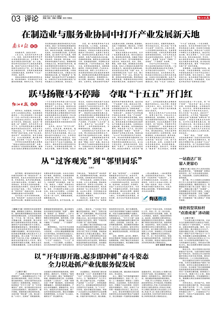 服务业如现代化产业体系的枝叶,枝繁才能叶茂,才能让参天大树绿树成荫、遮阳挡雨。过去两年,阳江深耕营商环境的沃土,锻造提升落实的筋骨,为企业发展提供了更有利条件、更广阔空间。市委将今年定为“提质服务年”,就是要推动全市上下改造办事机制和流程,改进工作作风、强化服务理念,加快打造市场化法治化国际化一流营商环境。抓好提质服务,必须拉高标杆、提升效能,阳江要深度衔接大湾区规则标准,全面对接“湾区通”工程,痛下决心改革机制、流程,全面提升办事效率和服务质效。抓好提质服务,必须革新理念、真抓实干。牢固树立“服务员”的主动意识,坚持围绕促进发展这一中心任务,将“用户思维”“需求导向”融入工作全过程。抓好提质服务,必须锻造作风、担当作为。营商环境的持续改善,关键在于干部的作风与担当。要大力弘扬“马上就办、真抓实干”的过硬作风,以干部的“勤奋指数”换取企业的“发展指数”和群众的“幸福指数”。制造业与服务业双向奔赴,关乎阳江高质量发展大局、现代化建设全局。要以制造业之强牵引服务业之优,以服务业之优增进制造业之强,让现代化产业体系这棵大树在阳江发展沃土上深深扎根、茁壮成长。