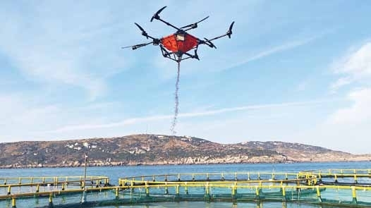 左图:巡天科技自主研发的智能投喂无人机在海上牧场进行投喂鱼饲料测试。