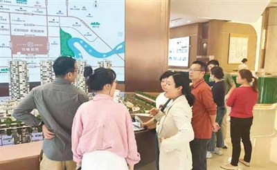 当日下午,记者来到位于市区新江南路与洛东大道交叉口附近的一家楼盘,看到不少顾客正围着园区规划沙盘看房、选房,销售人员热情地为顾客进行讲解。接待区几乎坐满了人,一些顾客正在翻看商品房资料,了解购房优惠活动,听取销售人员的建议。