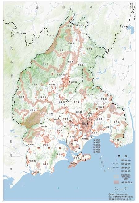 广东阳春鹅凰嶂省级自然保护区、广东阳春百涌省级自然保护区、岗列发王山自然保护区、岗列对岸三角洲原始红树林县级自然保护区、白沙石河自然保护区、埠场沿海防护林自然保护区、岗列大凹山鸳鸯湖自然保护区、岗列长其岭自然保护区、望瞭岭公园自然保护区、北山公园自然保护区、阳江江城青冲县级自然保护区、凤山自然保护区的用地范围。
