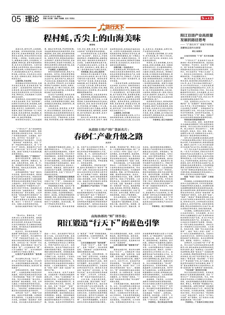- 阳江豆豉产业高质量发展的路径思考 谭戈 姚景深 从地方风味到“广货”名片的战略跃升 “广货行天下”是省政府于2026年推动的一场大型市场促销行动,旨在通过“政府搭台、平台助力、企业参与”的模式,将广东优质产品销到全国乃至全