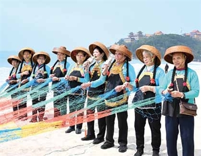 “三八”妇女节当天,在阳东区东平镇珍珠湾的沙滩上,东平奋姐渔歌队队员身着特色渔家服饰,用最质朴的方式庆祝属于自己的节日。她们头戴疍家帽,身着蓝衫黑裤,在海浪的伴奏下,她们一边娴熟地整理渔网,一边唱起了代代相传的渔歌。歌声里饱含着对大海的敬畏、对生活的热爱,也展现了渔家妇女坚韧乐观、自立自强的精神风貌。