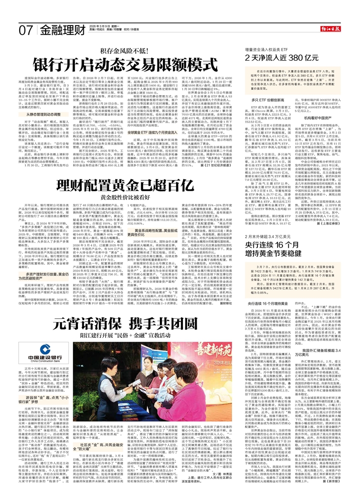 - 银行开启动态交易限额模式 受国际金价波动影响,多家银行再度加码贵金属业务风险管控力度。 3月3日,建设银行宣布,自3月4日起对建行金(含易存金)实施动态交易限额管理。同时,将配送类订单发货时间延长至客户下单后10-15