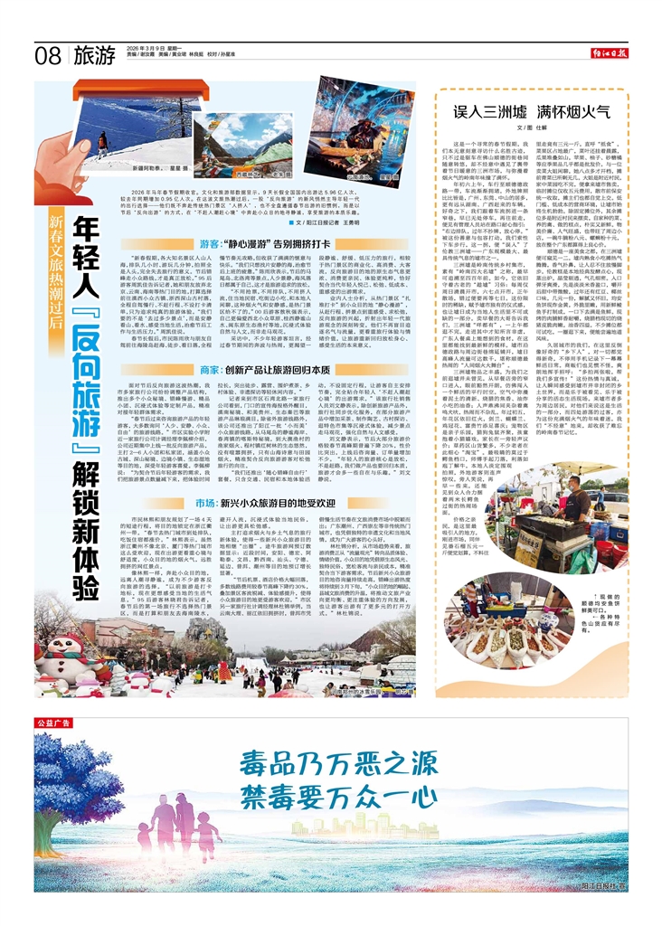 - 年轻人“反向旅游”解锁新体验 2026年马年春节假期收官。文化和旅游部数据显示,9天长假全国国内出游达5.96亿人次,较去年同期增加0.95亿人次。在这波文旅热潮过后,一股“反向旅游”的新风悄然主导年轻一代的出行选择——他们既