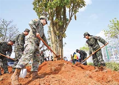 下图:官兵在阳江一中初中部挥锹植树。 梁文栋 摄