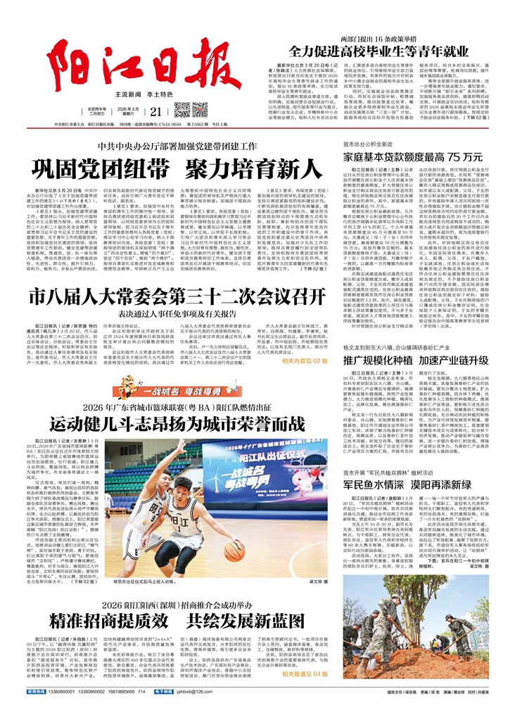 - 运动健儿斗志昂扬为城市荣誉而战 一战城名 粤战粤勇 阳江日报讯(记者/关雯静)3月20日,2026年广东省城市篮球联赛(粤BA)阳江队出征仪式在市体育馆主馆举行,为即将踏上省级赛场的篮球运动员加油鼓劲、壮行助威。阳江健儿斗志