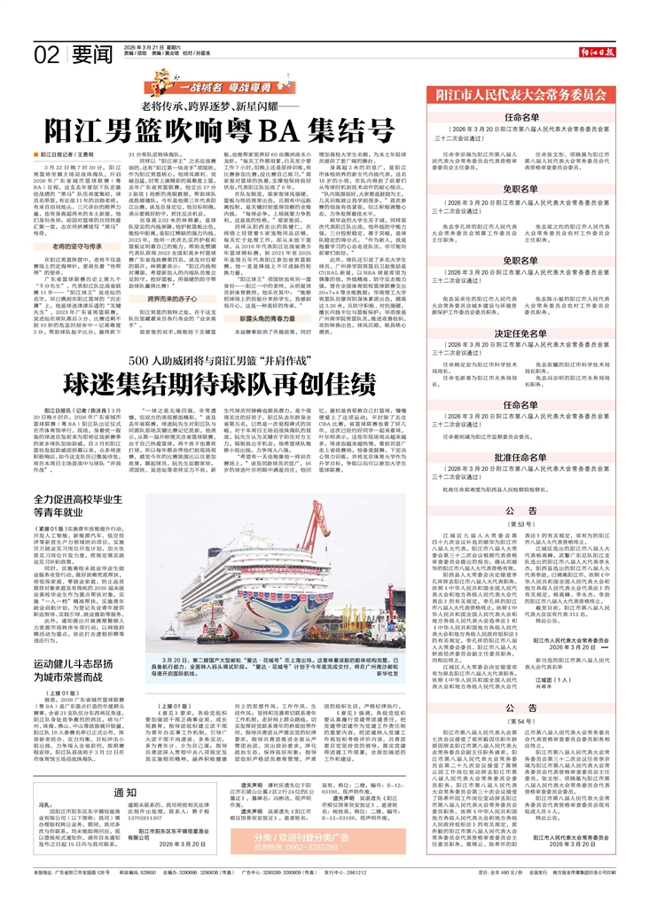 - 阳江男篮吹响粤BA集结号 一战城名 粤战粤勇 ■ 阳江日报记者/王勇明 3月22日晚7时30分,阳江男篮将坐镇主场迎战珠海队,开启2026年广东省城市篮球联赛(粤BA)征程。这支去年曾创下队史最佳战绩的“黑马”队伍