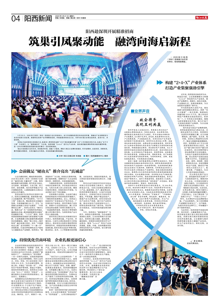 3月20日,2026阳江阳西(深圳)招商推介会在深圳举办。本次活动聚焦阳西优良的投资环境、清晰的产业发展规划与务实的招商引资政策,围绕特色优势产业开展精准招商,积极邀请深圳知名企业、世界500强企