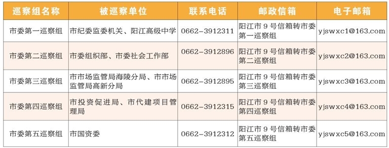 各市委巡察组将在被巡察单位工作2个月左右,巡察期间设专门值班电话、邮政信箱和电子邮箱,主要受理反映被巡察党组织领导班子及其成员、下一级党组织主要负责人和重点岗位人员问题的来信来电来访,重点是关于违反政治纪律、组织纪律、廉洁纪律、群众纪律、工作纪律和生活纪律等方面的举报和反映。