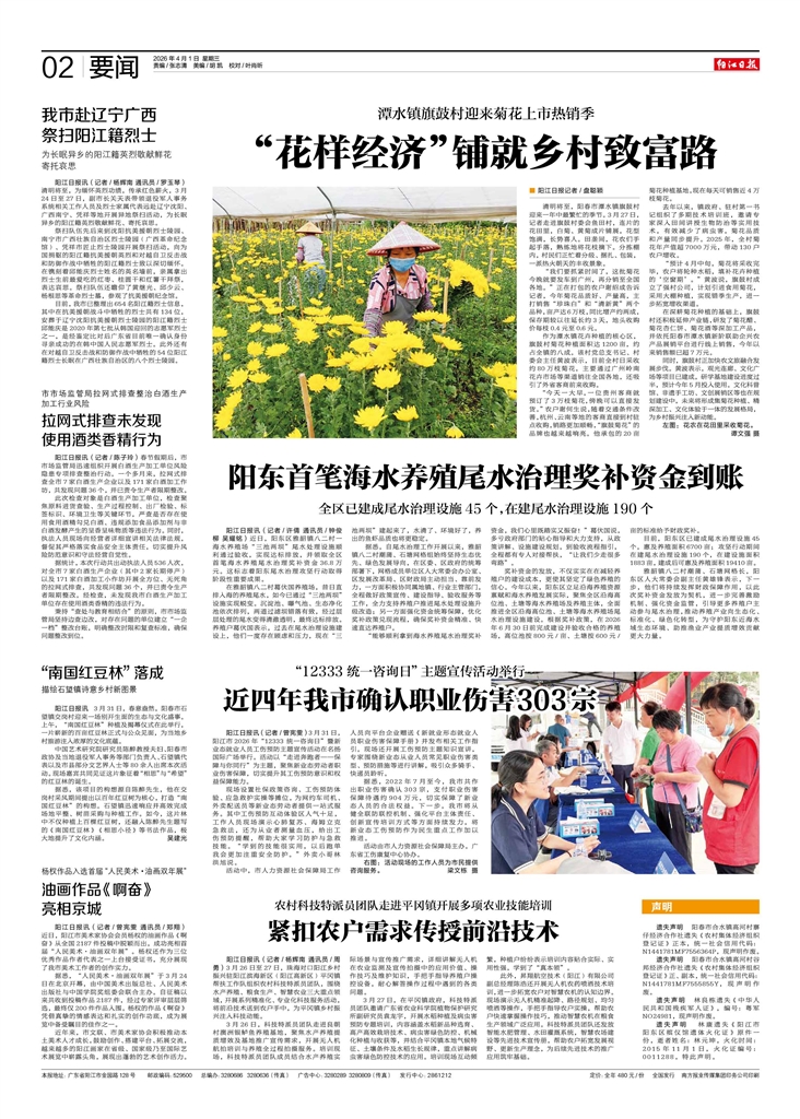 - “花样经济”铺就乡村致富路 ■ 阳江日报记者/盘聪颖 清明将至,阳春市潭水镇旗鼓村迎来一年中最繁忙的季节。3月27日,记者走进旗鼓村委会鱼田村,连片的花田里,白菊、黄菊成片铺展,花型饱满,长势喜人。田垄间,花农们手起手落