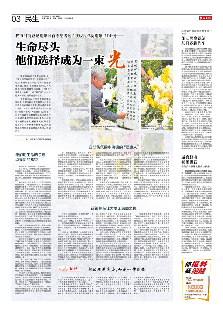 - 生命尽头 他们选择成为一束光 ■ 文/图 阳江日报记者 陈海涛 捐献器官,对大多数人来说,是一个遥远而沉重的话题。它常常与死亡、告别、悲恸联系在一起,让人本能地想要回避。然而,当生命走到尽头,有人欣然作出捐献器官的选择,让