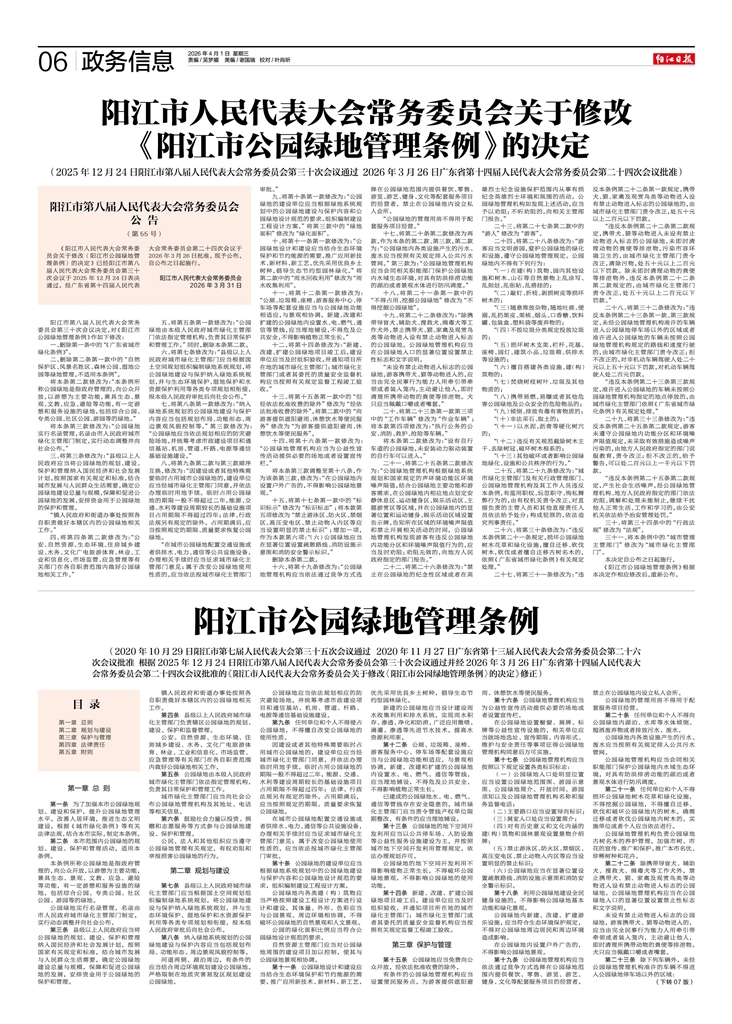 - 阳江市第八届人民代表大会常务委员会公告 《阳江市人民代表大会常务委员会关于修改〈阳江市公园绿地管理条例〉的决定》已经阳江市第八届人民代表大会常务委员会第三十次会议于2025年12月24日表决通过,经广东省第十四届人民代表大会常务委员会第