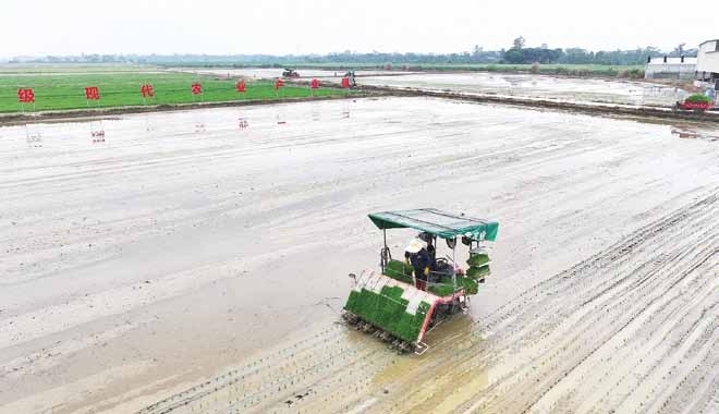4月2日,记者来到红丰镇潮观村阳江市漠阳香农业发展有限公司的现代农业基地,这里一派繁忙。高速插秧机嗒嗒作响,几个来回,田间便均匀插上了翠绿的秧苗。“这机器一小时能完成约6亩田的插秧任务,传统人工插秧一亩田得花一整天。”该公司董事长黄伯初介绍说。