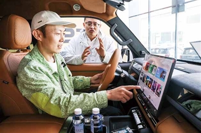 4月10日,消费者在山东省滕州市一家汽车销售中心选购新能源汽车。