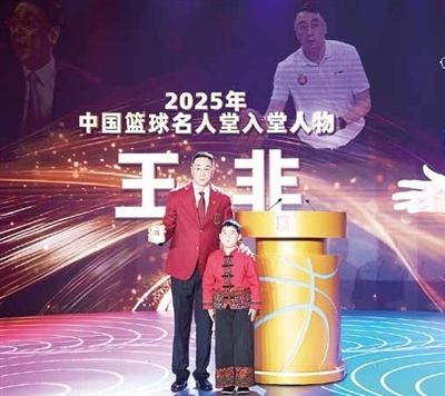 右图:中国篮球名人堂入堂人物“杰出教练员”王非(左)在入堂仪式上领取徽章。