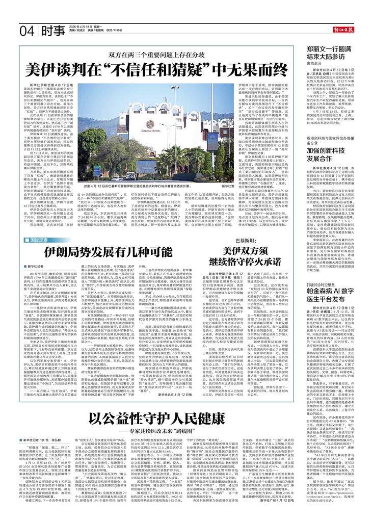 - 美伊谈判在“不信任和猜疑”中无果而终 新华社伊斯兰堡4月12日电 美国和伊朗在巴基斯坦首都伊斯兰堡的谈判12日结束,双方未达成任何协议。伊朗方面说,谈判处于“不信任和猜疑的气氛中”,双方在两三个重要问题上存在分歧。美国方面称,美方已非