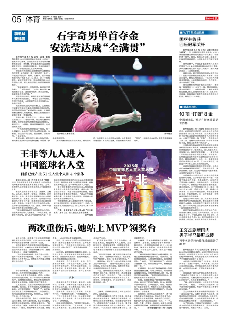 - 石宇奇男单首夺金 安洗莹达成“全满贯” 羽毛球亚锦赛 新华社宁波4月12日电(记者/夏亮 田光雨)2026年亚洲羽毛球锦标赛12日在宁波奥体中心落幕,国羽名将石宇奇首夺该项赛事男单冠军,李怡婧/罗徐敏战胜队友首次加冕女双桂冠;韩国队