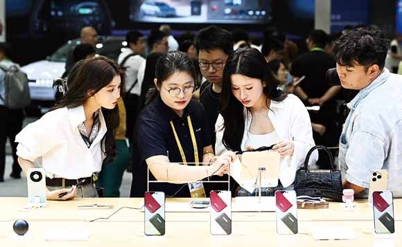 4月13日,参观者在第六届消博会主会场了解华为产品。