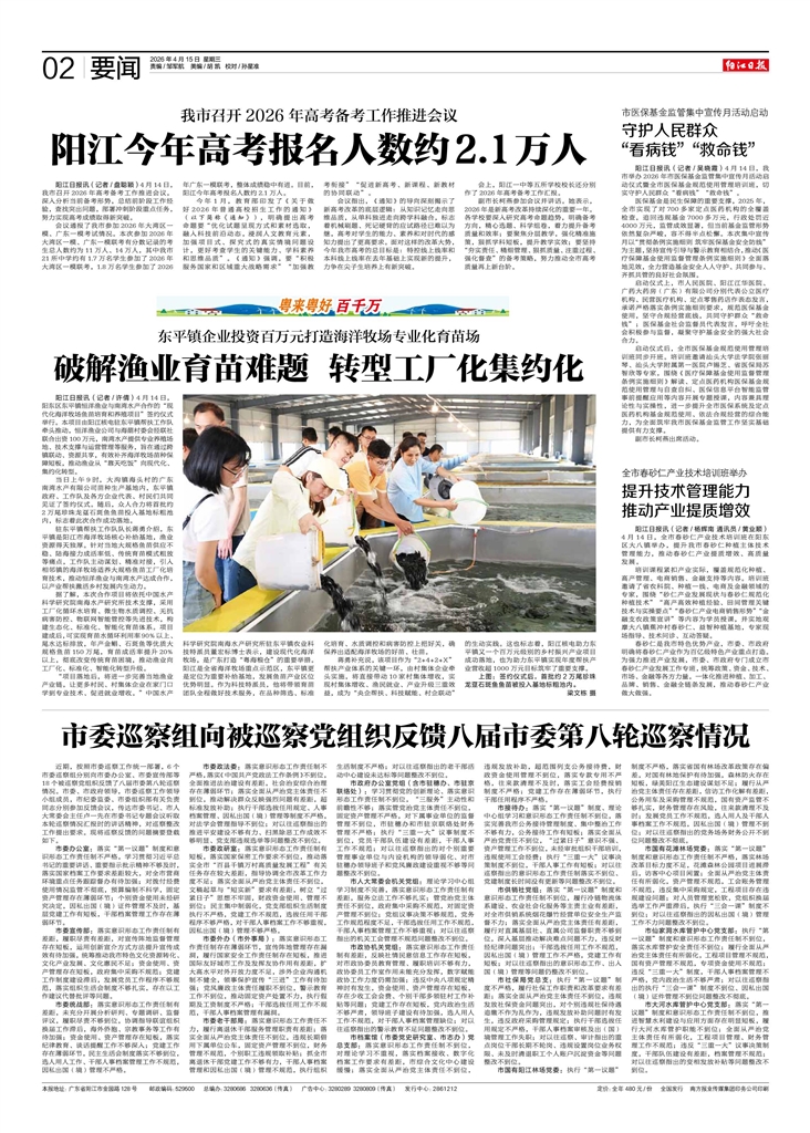 - 阳江今年高考报名人数约2.1万人 阳江日报讯(记者/盘聪颖)4月14日,我市召开2026年高考备考工作推进会议,深入分析当前备考形势,总结前阶段工作经验,查找突出问题,部署冲刺阶段重点任务,努力实现高考成绩取得新突破。 会议通